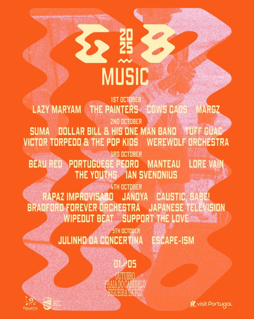 Japanese Television, Manteau, Wipeout Beat, The Youths e Tuff Guac, entre outros. Durante o dia, a praia será o cenário de concertos mais intimistas e improvisados, numa atmosfera descontraída.