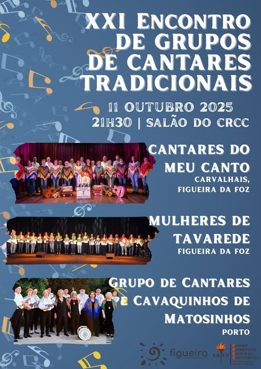 O Centro Recreativo e Cultural Carvalhense (CRCC), em Carvalhais de Lavos, acolhe no sábado, 11 de outubro, às 21h30, o XXI Encontro de Grupos de Cantares Tradicionais, uma iniciativa que celebra a música popular portuguesa e o convívio entre coletividades dedicadas à preservação das tradições orais e musicais portuguesas.