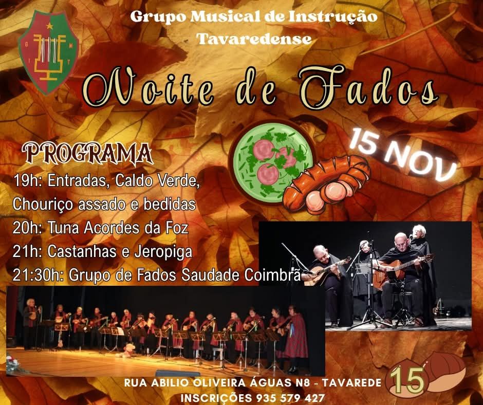 O Grupo Musical de Instrução Tavaredense promove sábado, dia 15, pelas 19h00, uma Noite de Fados que promete aliar boa música e sabores tradicionais.