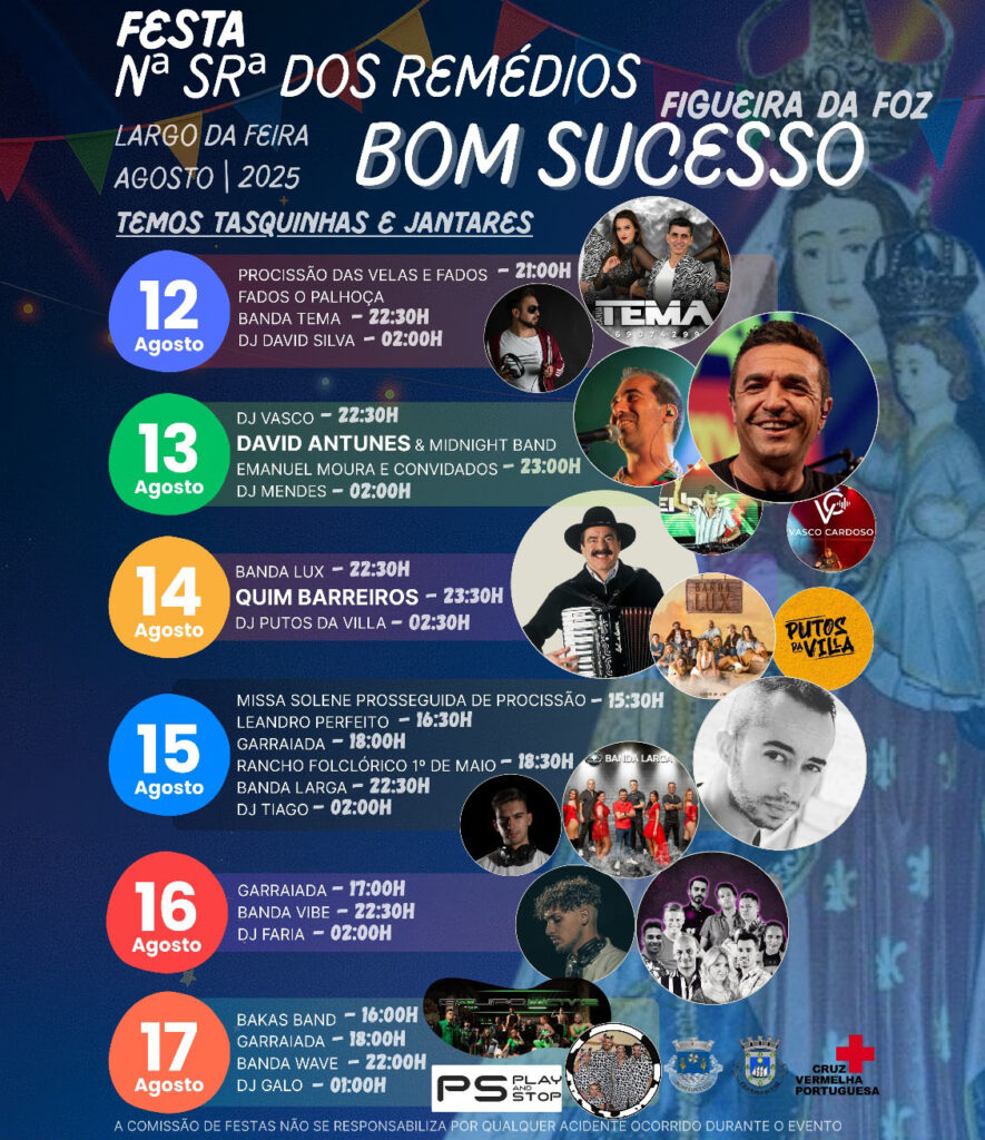 A povoação de Bom Sucesso prepara-se para celebrar a tradicional Festa em Honra de Nossa Senhora dos Remédios, no Largo da Feira, de 12 a 17 de Agosto. Este evento, repleto de tradição e alegria, promete animar a comunidade local com uma série de atividades e espetáculos para todas as idades.