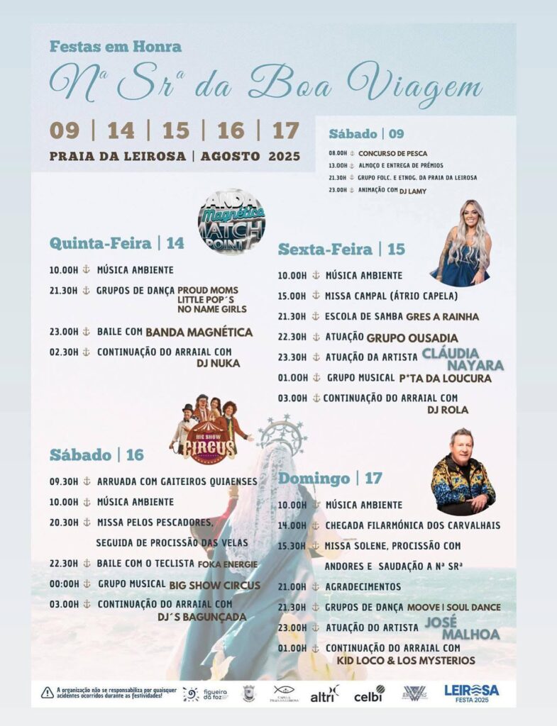A comunidade da Praia da Leirosa celebra as Festas em Honra de Nossa Senhora da Boa Viagem, evento que promete momentos de fé, música e convívio. A entrada é livre para todos os participantes.
