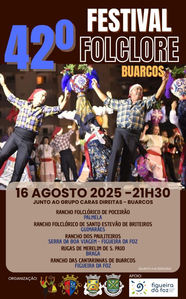 O Festival de Folclore de Buarcos regressa no próximo dia 16 de agosto, às 21h30, para a sua 42.ª edição, prometendo uma noite de celebração da cultura popular portuguesa, junto ao Grupo Caras Direitas, no coração da vila. Com um cartaz diversificado, o festival reúne grupos etnográficos de várias regiões do país, numa mostra viva de danças, cantares e trajes tradicionais, contribuindo para a preservação e divulgação do património imaterial português. O programa conta com a atuação dos seguintes grupos: