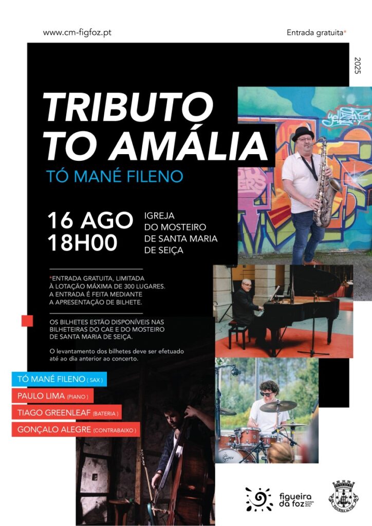 No cenário único da Igreja do Mosteiro de Santa Maria de Seiça, assista a um tributo emocionante à voz eterna de Amália Rodrigues, com a banda d saxofonista Tó Mané Fileno. Entrada gratuita, limitada a 300 lugares. Bilhetes disponíveis na ticketline e nas bilheteiras do CAE e do Mosteiro de Seiça. O levantamento dos bilhetes deve ser efetuado até ao dia anterior ao concerto, ou seja, até dia 15 de agosto.