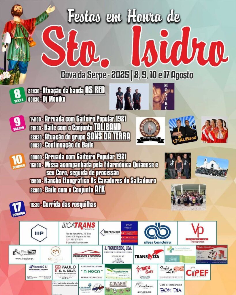 A aldeia da Cova da Serpe (Quiaios) está prestes a acolher as Festas em Honra de Santo Isidro, que decorrerão nos dias 8, 9, 10 e 17 de Agosto de 2025. Este evento, organizado pela Comissão de Festas Santo Isidro 2025, promete trazer momentos de música, comunhão e fé para toda a comunidade.