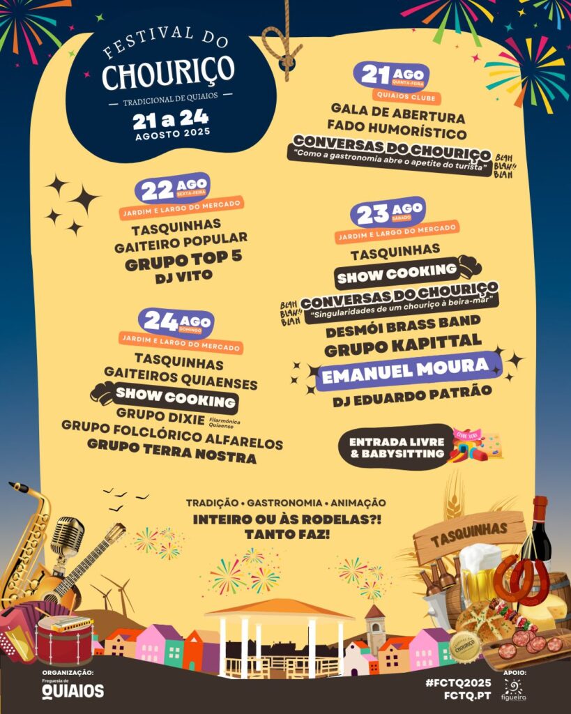 Durante quatro dias, a aldeia transforma-se num espaço de convívio e celebração da gastronomia, onde o chouriço é rei, mas a festa vai muito além da mesa. Música popular, animação comunitária e espírito associativo são a receita de um festival que já conquistou lugar de destaque no calendário de verão do concelho da Figueira da Foz.