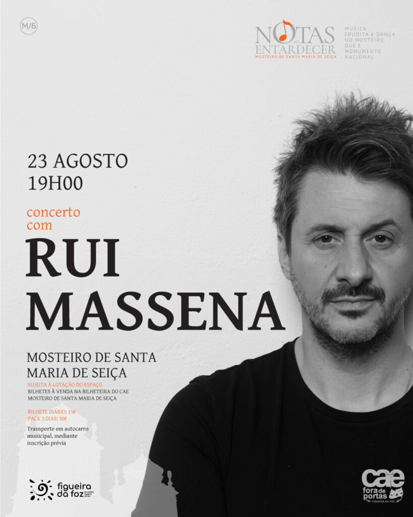 Sábado, dia 23, pelas 19h00, Rui Massena – pianista, maestro e compositor que tem reinventado a música clássica para novos públicos, cruzando-a com elementos modernos e uma estética cinematográfica – inicia o ciclo “Notas ao Entardecer – Música e Dança sob o Céu do Mosteiro”, um evento que está de regresso ao emblemático Mosteiro de Santa Maria de Seiça, monumento nacional situado no concelho da Figueira da Foz, para uma edição de verão que alia património, música erudita e dança contemporânea.