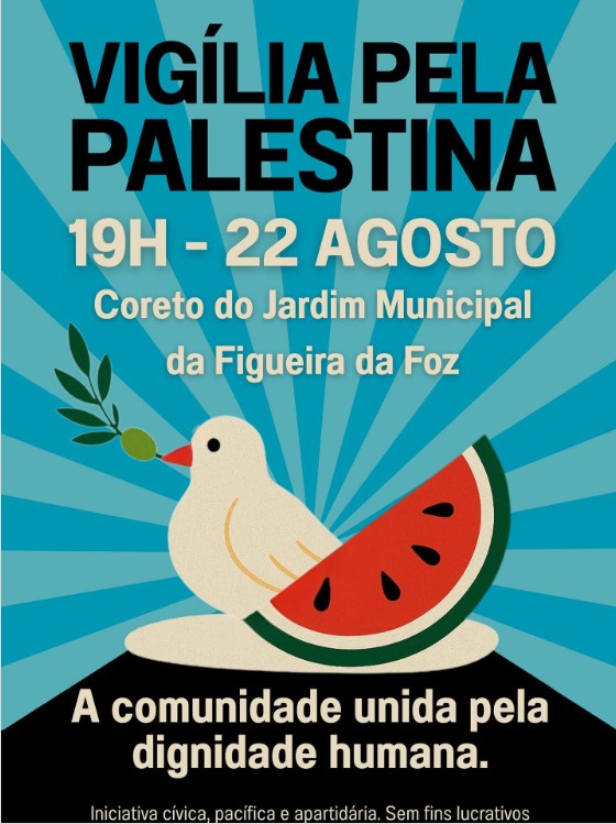 Sexta-feira, 22 de agosto, às 19h00, no Coreto do Jardim Municipal da Figueira da Foz, realiza-se a Vigília pela Palestina. “Um encontro pacífico, apartidário e aberto a todos os que se inquietam com esta calamidade humanitária, onde nos unimos em solidariedade para exigir respeito pela dignidade humana e paz na região”, refere a organização.