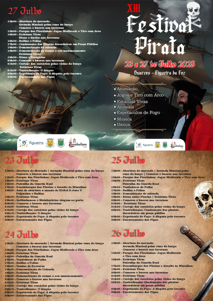Até domingo, dia 27, as muralhas de Buarcos voltam a transformar-se num autêntico porto corsário com a realização da 13.ª edição do Festival Pirata. Durante cinco dias, as ruelas históricas da vila acolhem um dos eventos mais emblemáticos do verão figueirense, que promete encantar todas as gerações com o seu ambiente festivo e cenografia inspirada na época dourada da pirataria.
